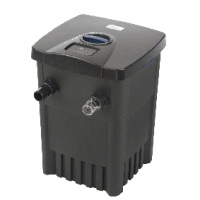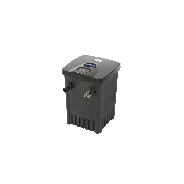 Oase FiltoMatic CWS 7000 bassin filter med indbygget UVC til at bekæmpe svævalger (grønt vand), dette havedams filter kan graves ned, svampene renses ved at trække i håndtagene på havedams filteret og derefter starte slampumpen som er indbygget i havedams filteret hvorved det beskidte vand pumpes ud af filteret - slampumpen kan indstilles så den automatisk pumper slam ud fra bunden af havedams filteret.