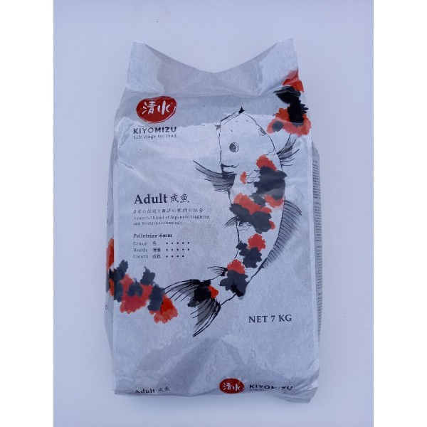 Voksne koikarper vokser langsommere og begynder at udvikler deres kopsform og farve, det er derfor en god ide at ændre deres foder og sørge for at de får den kost som de har behov for på det stadige i livet. Derfor er det en god ide at fodre med Kiyomizy adult som er tilpasset netop dette stadige i en koi`s liv.